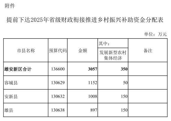 为支持做好全省巩固拓展脱贫攻坚成果同乡村振兴有效衔接工作,提高预算完整性,加快支出进度,根据河北省财政厅《关于提前下达2025年省级财政衔接推进乡村振兴补助资金预算的通知》(冀财农〔2024〕112号),现提前下达2025年省级财政衔接推进乡村振兴补助资金预算(详见附件)。该项资金预算指标列2025年政府收支分类科目“1100231巩固脱贫攻坚成果衔接乡村振兴转移支付收入”,支出功能分类科目列“21305巩固脱贫攻坚成果衔接乡村振兴”。同时,对资金的使用管理提出如下要求: