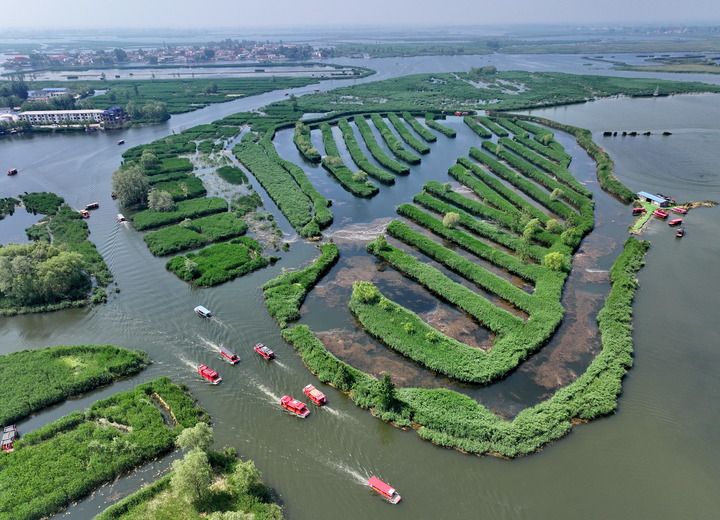 游船在白洋淀内游览(2024年5月8日摄)。新华社记者 牟宇 摄