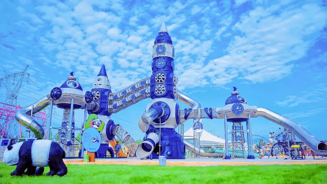 步入活力小镇内,处处可见“熊猫”的身影。它们在充满着赛博朋克风的太空滑滑梯旁、满是童趣的森林探险旁、非常考验小朋友们体能的绳网攀爬旁……