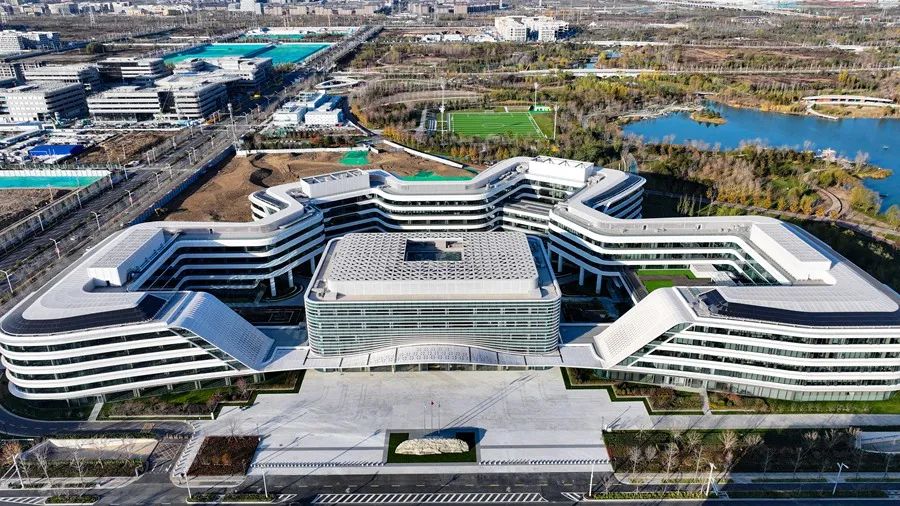 日前,走在雄安新区启动区雁翎大街,一栋白色的建筑格外引人注目。从空中俯瞰,它的楼体中心像古代的玉器玉琮,暗合卫星本体,周边飘带如花瓣绽放,恰似环绕的卫星轨道。它就是首家落户雄安新区的中央企业——中国星网的总部办公大楼。2024年10月14日,中国星网在这里正式办公。