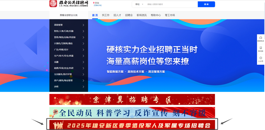即日起登录雄安公共招聘网,进入“2025年雄安新区春季退役军人及军属专场招聘会”模块,点击后即可查看报名企业的全部岗位并进行简历投递。