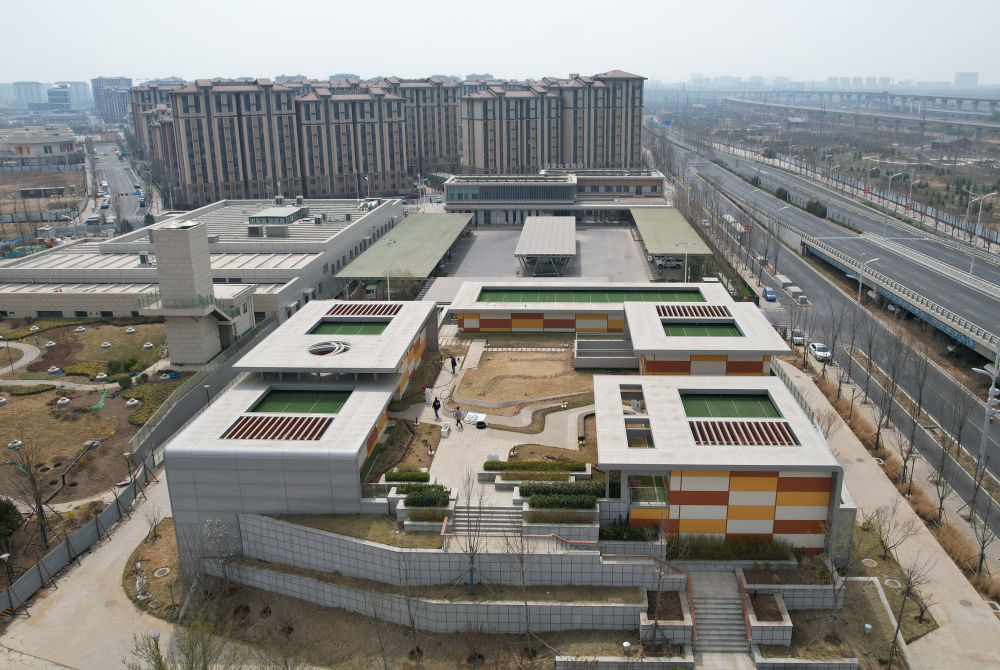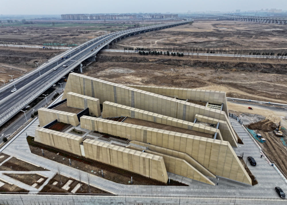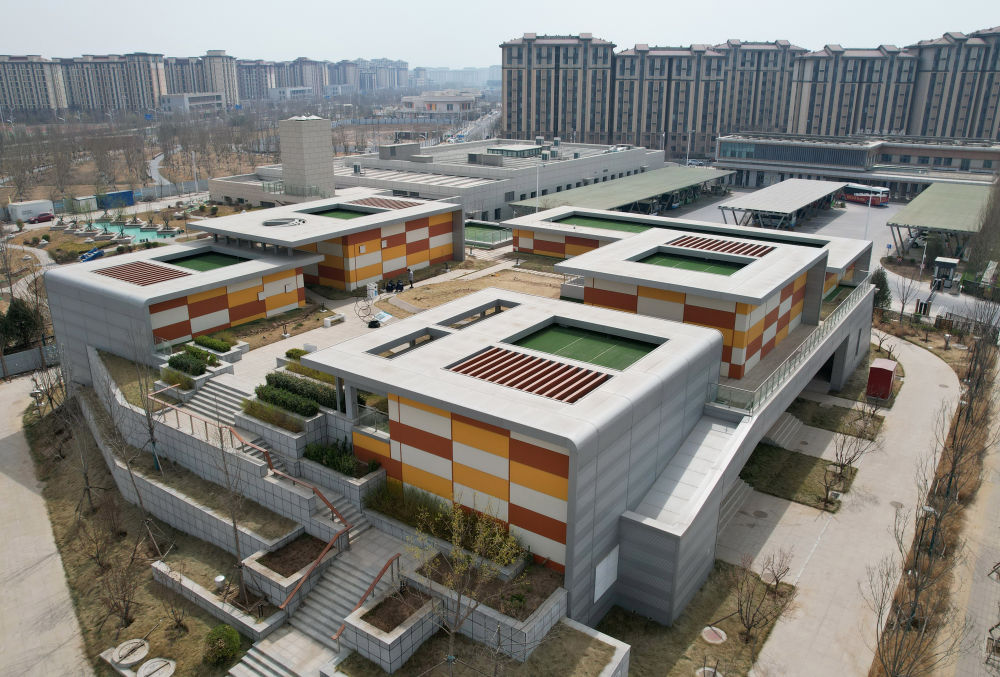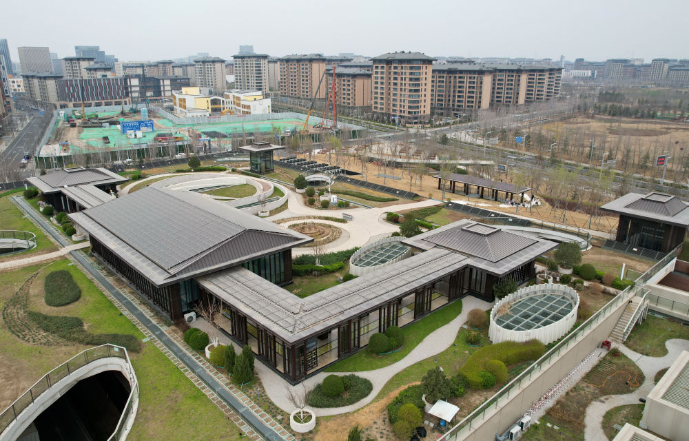 3月26日拍摄的河北雄安新区“智慧能源立方”——剧村220千伏变电站外景。该变电站屋顶覆土建设成公园,形成与城市融合共生的图景(无人机照片)。新华社记者 杨世尧 摄