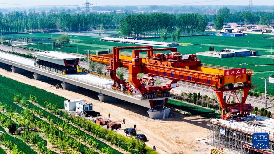 4月15日,在雄商高铁山东省济宁市梁山段,中铁十局的工作人员在进行箱梁架设作业。