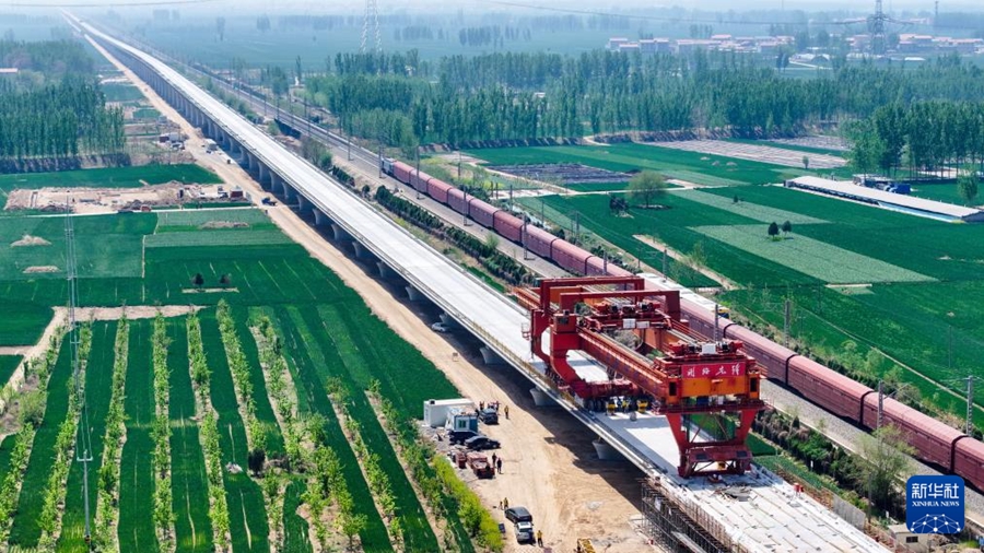4月15日,在雄商高铁山东省济宁市梁山段,中铁十局的工作人员在进行箱梁架设作业。