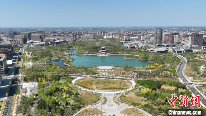 4月14日,航拍河北雄安新区容东片区金湖公园。(无人机照片)中新网记者韩冰 摄
