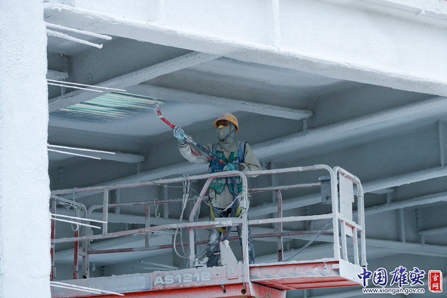 大河片区安置区公交首末站项目位于雄安新区大河片区安置配套区DH01-01-03地块。首末站主楼地上二层,修车库地上一层,首末站主楼和修车库下部均设一层地下室,并连成整体,物流中心地上一层。图为雄安建设者在该项目建设工地进行钢结构防火涂料施工。