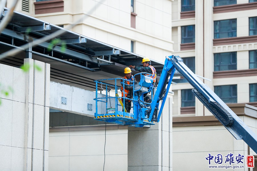 目前雄县科创产业园项目正在进行机电安装、幕墙样板施工。下一步,该项目进入大规模的幕墙安装施工阶段。图为雄安建设者“五一”假期期间坚守岗位。