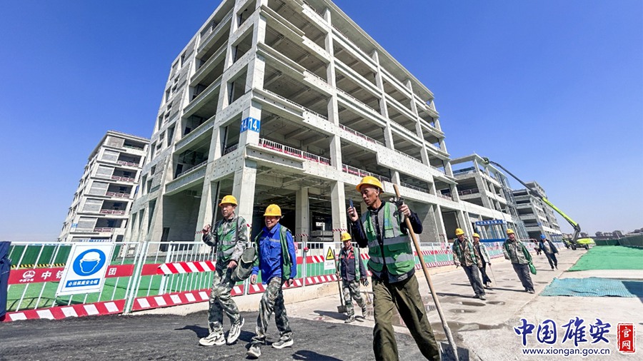 图为大河片区安置房及配套设施项目建设现场,雄安建设者正在作业。