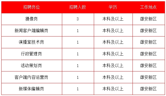 中化方胜能源管理服务有限公司雄安分公司根据工作需要,现面向社会公开招聘摄像岗、新闻客户端编辑岗、演播室技术岗、行政管理岗、活动策划岗、客户端内容运营岗、新媒体编辑岗等岗位工作人员,诚邀您的加入。