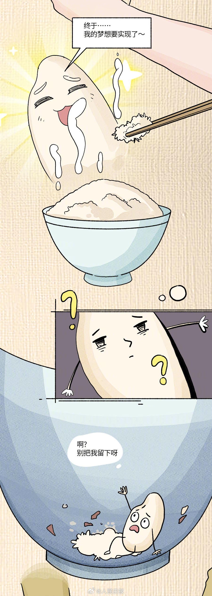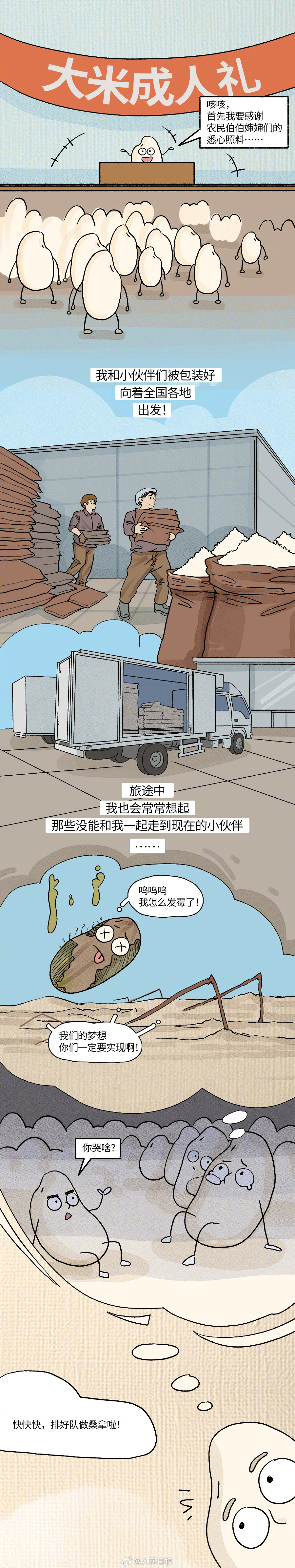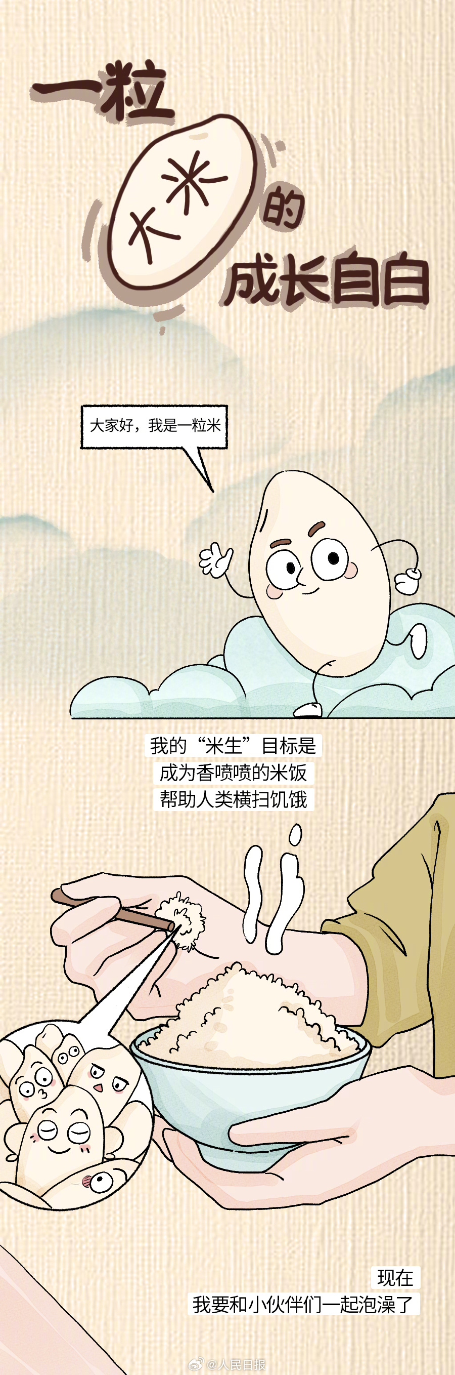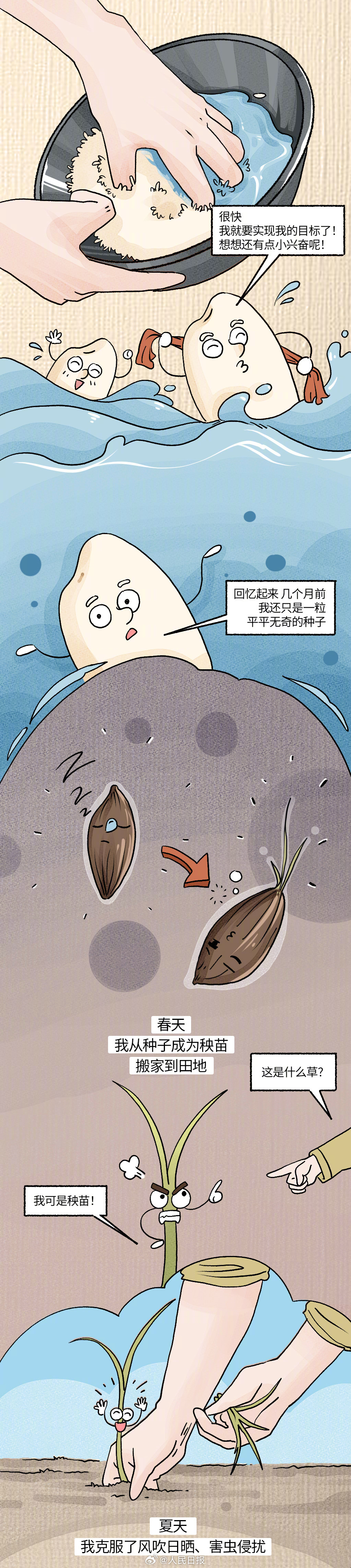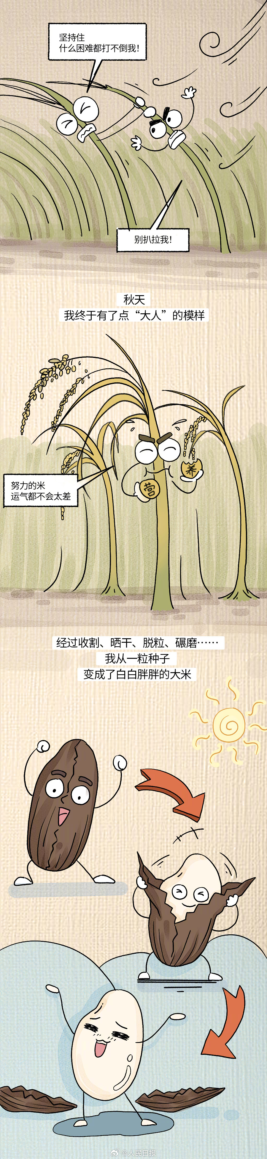 春天,从种子成为秧苗;夏天,要克服风吹日晒、害虫侵扰;秋天,经历收割、晒干、脱粒、碾磨……一粒米要历经多少艰辛,才能到达你的餐桌?戳漫画看从一粒种子到被端上餐桌有多难。珍惜粮食,拒绝浪费,做合格干饭人!