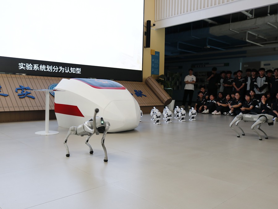 本次成果展精心设置了三大核心展示模块,包括人才培养、科学研究、社会服务。展览中,“超级列车—未来无边界的工程教育实践”教学场景借助人工智能、虚拟现实及3D建模技术,将科研与教学实践深度融合;高铁轨道巡检视觉感知虚拟仿真项目让巡检车在虚拟轨道上精准识别病害;灵活自主的智能机器狗现场演示了敏捷动作和精准交互;精巧互动的桌面机器人直观诠释了人工智能基础技术的魅力。展览现场互动热烈,雄安容和第一高级中学的师生们被前沿科技深深吸引,踊跃体验。