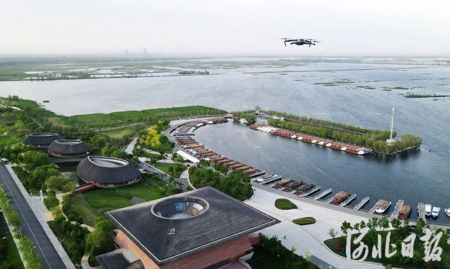 4月30日,无人机通过“北斗+”高精度定位技术,对白洋淀旅游码头区域进行巡航监测。河北日报记者刘光昱 摄