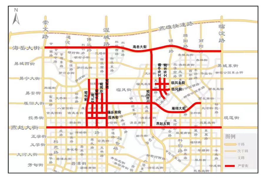 根据工作需要,在启动区设置15处道路交通秩序严格管理路段。海岳大街(临淀路至崇文路);燕赵大街(临淀路至崇文路);白洋淀路(海岳大街至燕赵大街);渥城路(海岳大街至燕赵大街);雁翎大街(端阳路至博远路);文德路(易宁大街至燕赵大街);博远路(易宁大街至燕赵大街);临风北街(锦朋路至文华西路);临风街(锦朋路至白洋淀路);康乐南街(渥城路至博远路);揽秀街(渥城路至博远路);文华东路(易宁大街至大成街);文华中路(易宁大街至大成街);怀源路(勤学街至康乐南街);荣礼路(雁翎大街至揽秀街)。