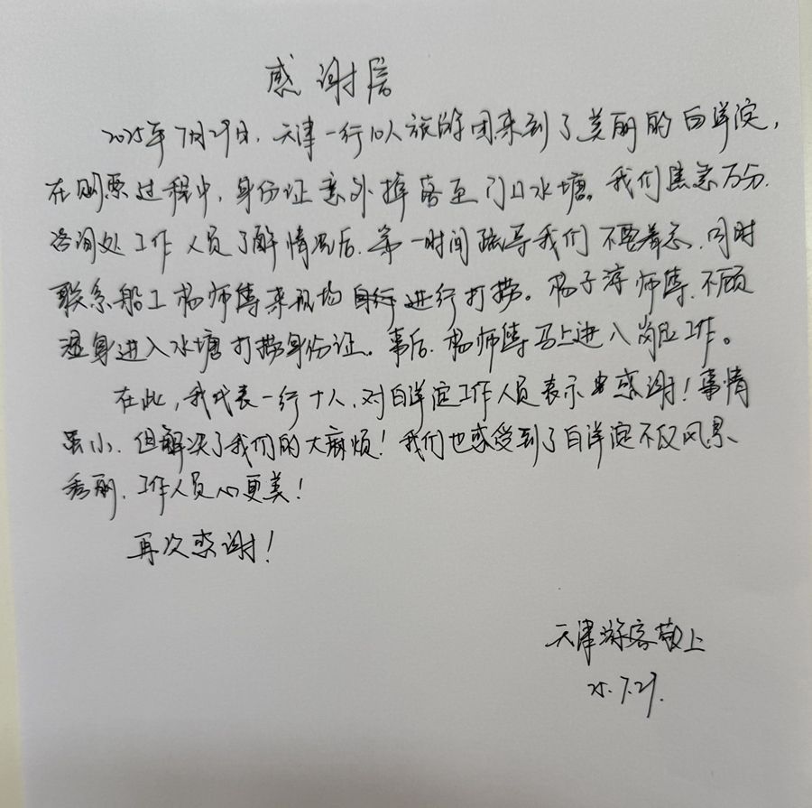 更令人动容的是,游客团在登船游览前特意折返白洋淀景区游客中心,郑重递上一封手写感谢信。信中写道:“杨子淳师傅不顾湿身进入水塘打捞身份证。事后,杨师傅马上进入岗位工作……事情虽小,解决了我们的大麻烦!”