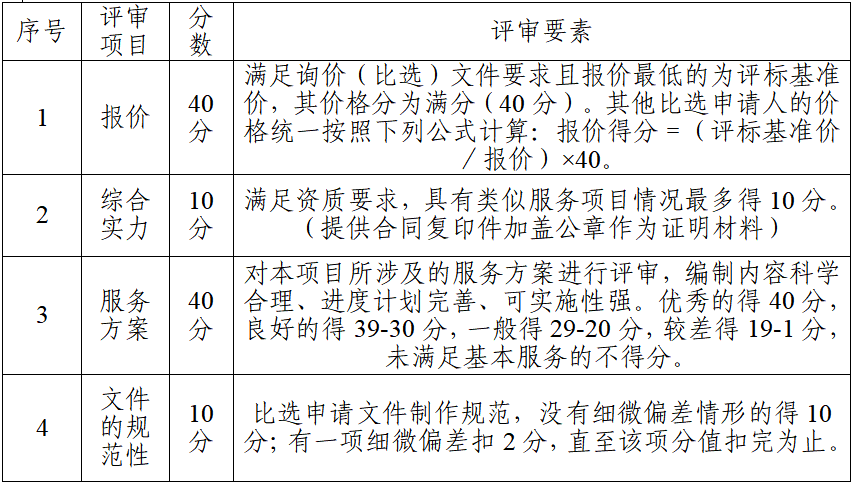 本项目比选采用综合评分法,总分为100分。按照公平、公正竞争原则,根据比选申请人所提供的服务方案、业绩、价格等进行综合评选,择优确定评估机构。