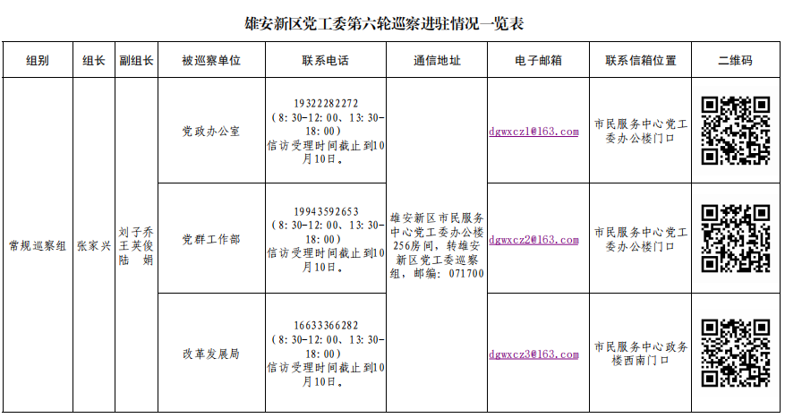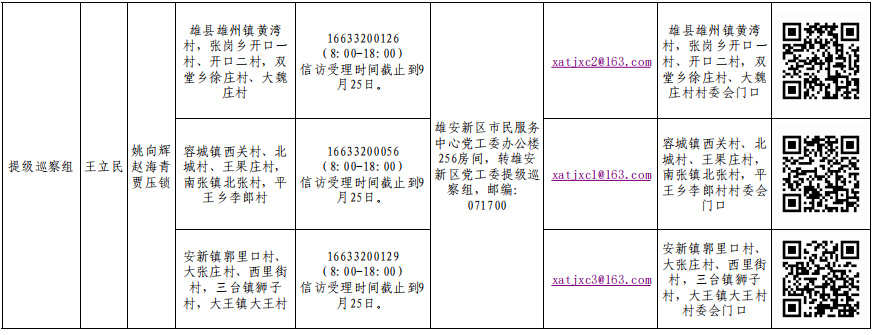 根据雄安新区党工委关于巡察工作的统一部署,截至8月15日,雄安新区党工委第六轮巡察完成进驻工作。2个新区党工委巡察组将对党政办公室、党群工作部、改革发展局3个职能部门的党组织开展常规巡察;对雄县黄湾村、开口一村、开口二村、徐庄村、大魏庄村,容城县西关村、北城村、王果庄村、北张村、李郎村和安新县郭里口村、大张庄村、西里街村、狮子村、大王村15个村的党组织开展提级巡察。