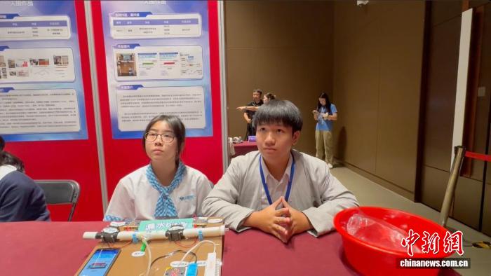 8月14日至17日,由中国科学技术协会、中国宋庆龄基金会共同主办的2025年宋庆龄少年儿童未来科学日暨第二十届宋庆龄少年儿童发明奖颁奖活动在河北雄安新区举行。图为8月16日,来自香港伊利沙伯中学旧生会汤国华中学的梁芷浟、陈钧兆为记者介绍发明。李百加 摄