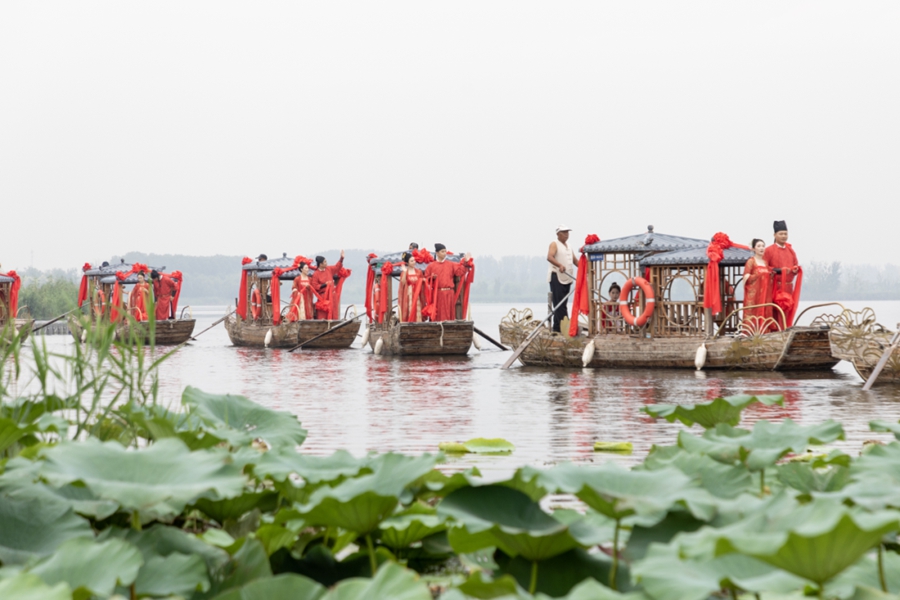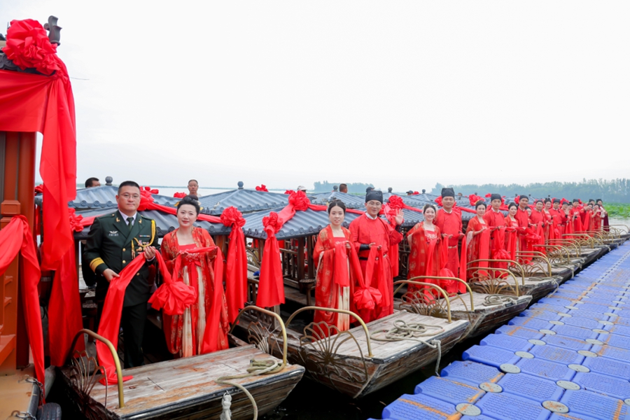 新人身着中式礼服,踏着红毯,在白洋淀边缓步入场,盟誓成礼。集体婚礼将传统婚俗的庄重与雄安青年的浪漫相融。