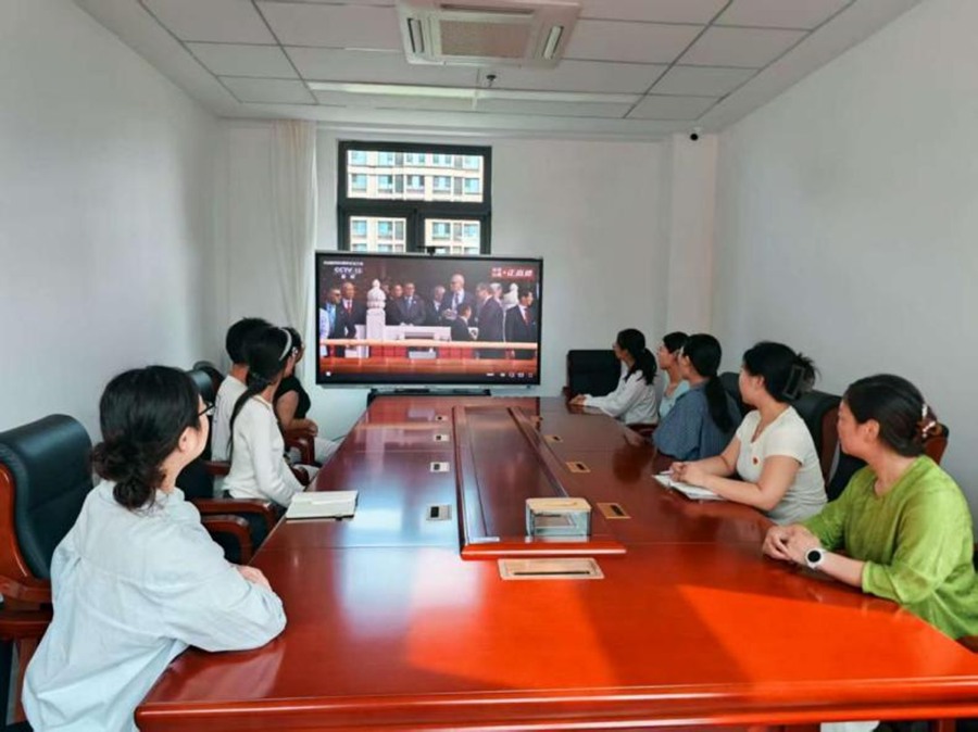 雄安雄东长宁幼儿园教师观看阅兵仪式。雄安雄东长宁幼儿园供图