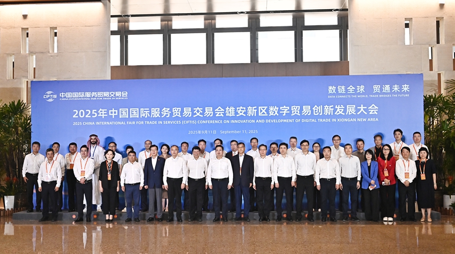 张国华与参加2025年中国国际服务贸易交易会雄安新区数字贸易创新发展大会的部分重要嘉宾合影。刘向阳 摄