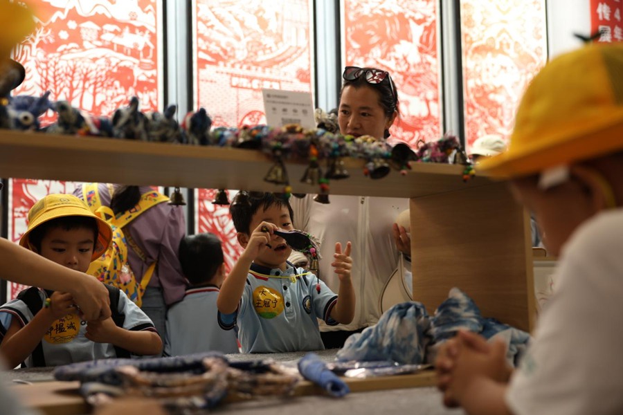 活动前,各班级师生共同商议确定特色路线,孩子们带着期待有序乘车出发。教师化身“行走的讲解员”,为学生讲述张家口冬奥故事、沧州武术文化等,部分学生还主动当起“家乡导游”。在绿博非遗场馆,学生观赏体验皮影戏《东郭先生与狼》,参与陶泥、扎染、剪纸互动,近距离感受非遗魅力;大风吹、丢手绢、彩虹伞等亲子游戏将欢乐氛围拉满;正午野餐时,孩子们主动分享月饼、家乡特产。