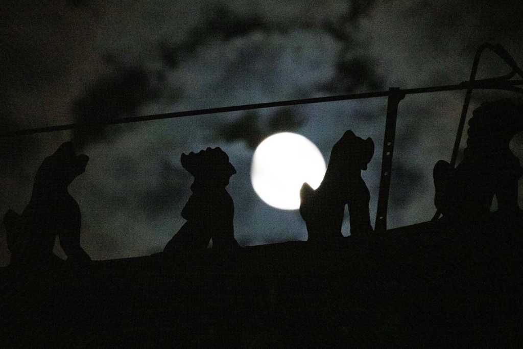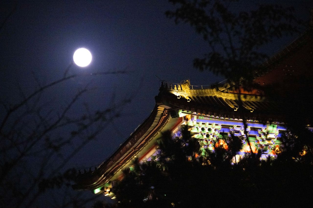 10月6日晚,定安阁檐角上的神秘“屋脊兽”与中秋圆月相映成趣。雄安媒体中心王伟倩 摄
