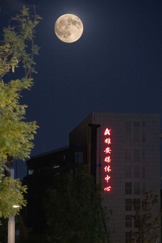 10月6日,农历八月十五,中秋佳节。当晚,雄安新区上空升起“超级月亮”。夜幕下,雄安体育中心、悦容公园安和塔、金湖公园定安阁等地标建筑与圆月同框,呈现出一幅美轮美奂的中秋画卷。