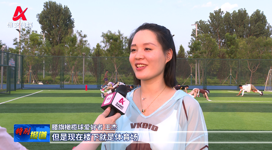 我是一名来自北京的体能训练师,今年年初来到我们雄安,发现我们雄安的免费场地特别多,而且配套设施也特别好,像我们脚底下这个草都是很软的,跑起来特别舒服,就特别适合推广我们的腰旗橄榄球。