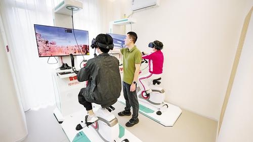 10月9日,在雄安新区容东片区龚庄社区党群服务中心“幸福空间”的VR单车运动空间,社区居民正戴着VR眼镜“骑行”。河北日报见习记者郝金钰 摄