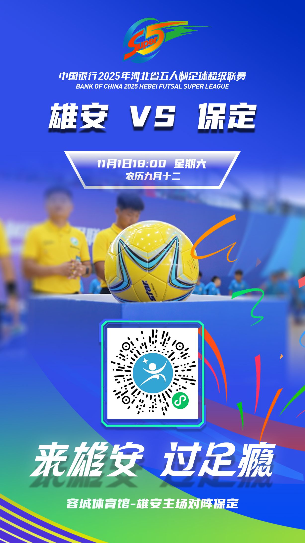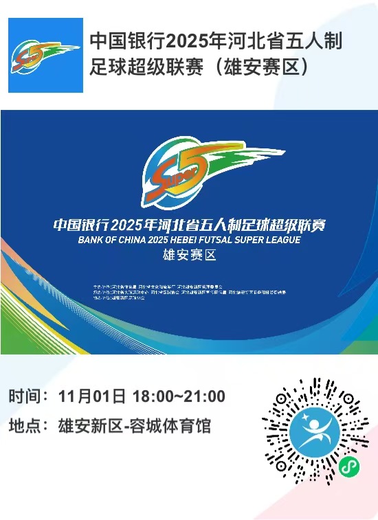 11月1日18:00,2025中国银行河北五超第十二轮雄安主场将在雄安新区容城体育馆打响,雄安新区队迎战保定队。