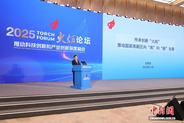 11月6日,2025火炬论坛在河北雄安新区举办。此次火炬论坛以“发展高科技,实现产业化,推动科技创新和产业创新深度融合”为主题,按照“1+5”的创新架构,举办1场高规格主论坛、 5场各具特色的平行论坛。论坛开幕式上,现场点燃“数字火炬”,启动“国家高新区对口协作机制”,推动上海张江高新技术产业开发区、南京高新技术产业开发区、无锡高新技术产业开发区、苏州工业园区、合肥高新技术产业开发区等头部国家高新区与河北雄安高新技术产业开发区开展产业协作、结对共建。图为2025火炬论坛启动仪式现场。中新社记者韩冰 摄