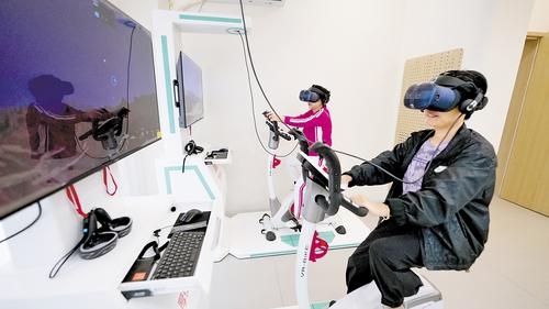 VR运动积极心理空间充满科技感与活力。袁金花戴好VR眼镜,骑上动感单车,车上的心率监测器实时显示数据,眼前则是“黄山之巅”的虚拟美景。“现在每周都来骑两次,既能锻炼身体,还能‘云旅游’,心情都变好了!”她笑着说。