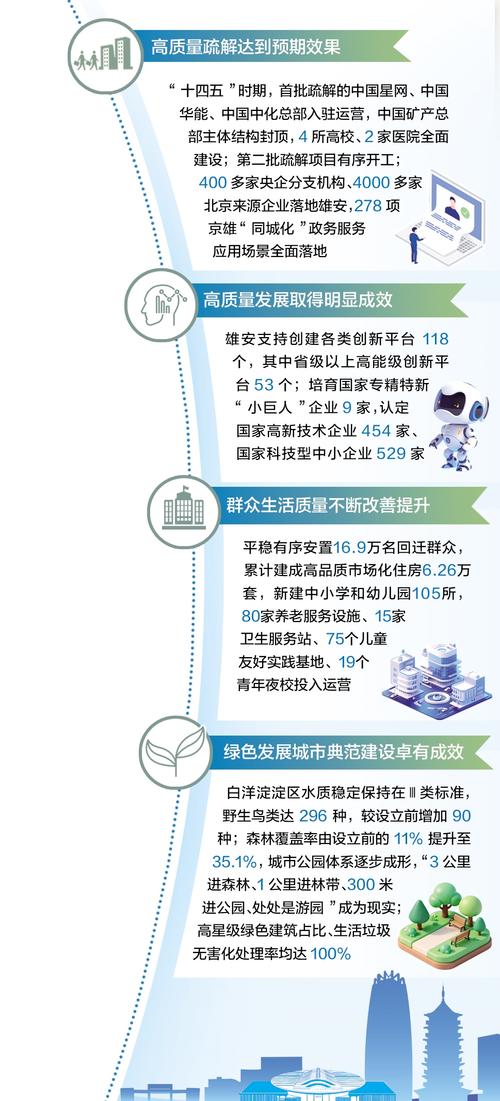 疏解项目加速落地。首批中央疏解清单内项目建设全面提速,中国星网、中国中化、中国华能总部已迁驻雄安,中国矿产总部主体结构实现封顶,首批4所高校和北大人民医院雄安院区、北京协和医院国家医学中心(雄安院区)正全面大规模建设;第二批疏解清单项目稳步推进,中国大唐总部启动建设,多家央企总部完成供地。截至目前,400多家央企分支机构、4000多家北京来源企业已顺利落地雄安。