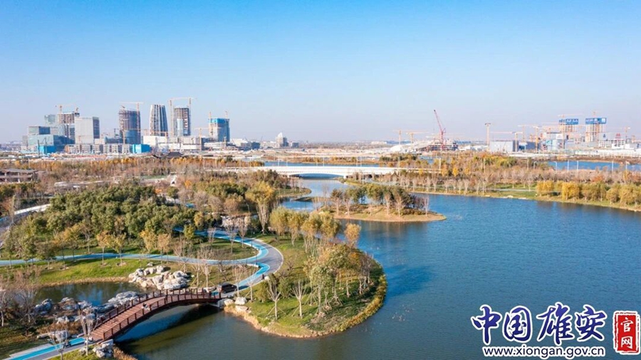 航拍初冬时节的启动区,生态美景与远处建筑交相辉映。中国雄安官网牛思佳 摄