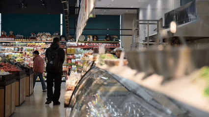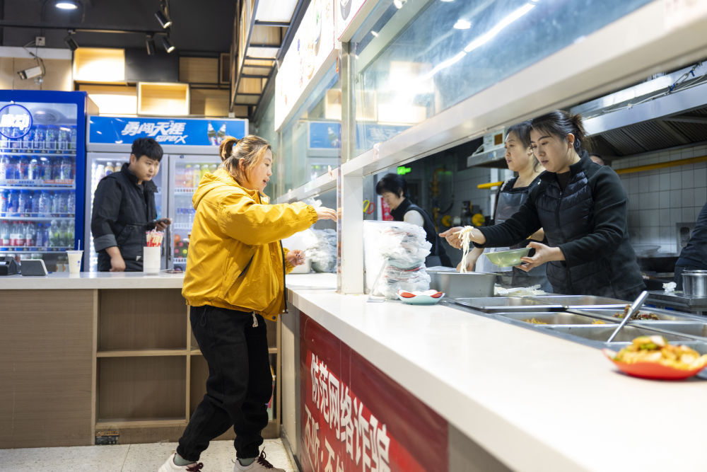 11月25日,人们在文华社区华序府智慧食堂内取餐时,屏幕自动显示所取的菜品重量和热量。