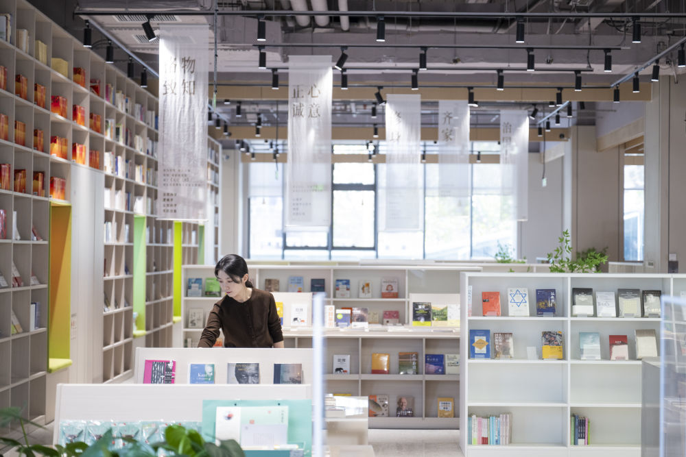 11月25日,在文华社区樊登书店,工作人员在整理书架。