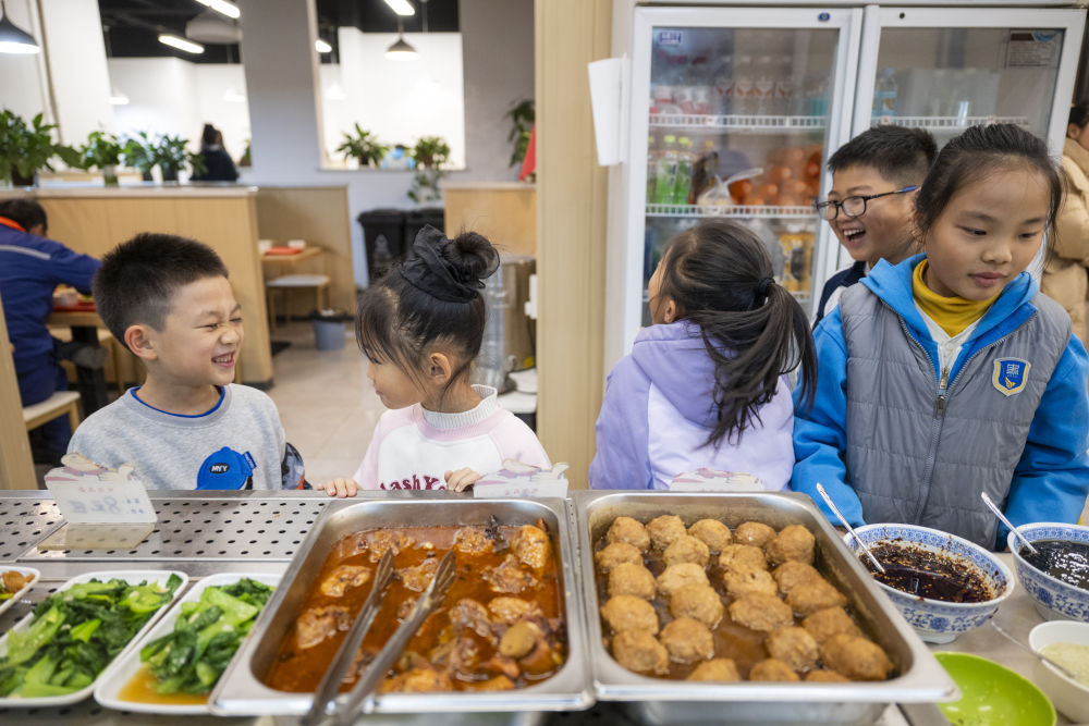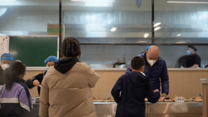 11月25日,放学的小朋友们在春明北社区食堂内排队取餐。