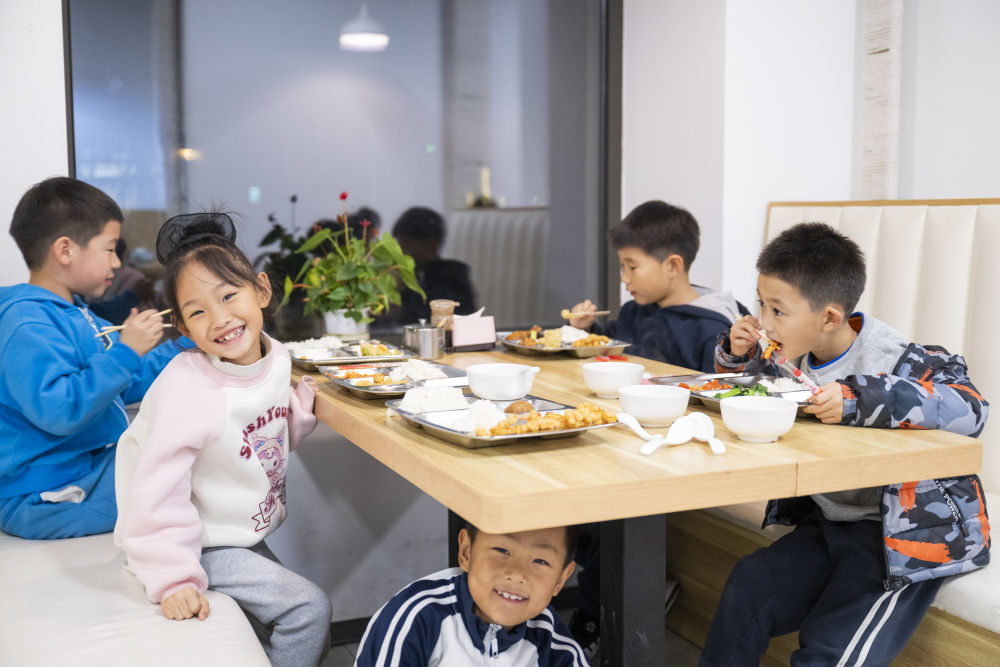 11月25日,放学的小朋友们在春明北社区食堂内用餐。