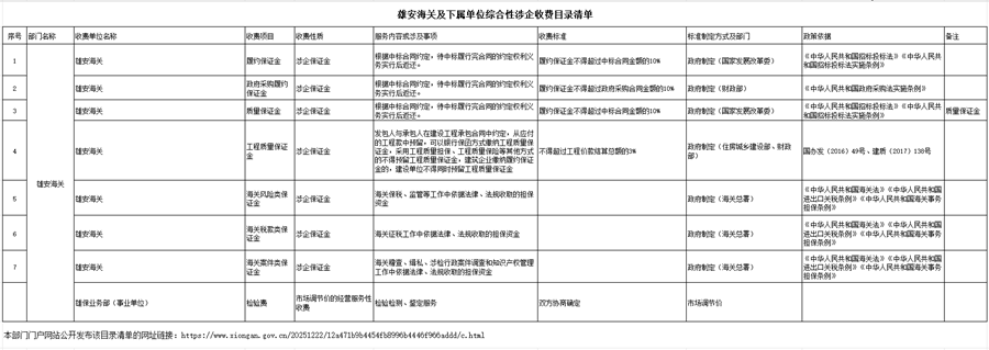 雄安海关及下属单位综合性涉企收费目录清单