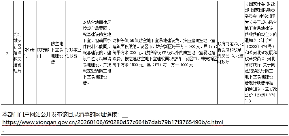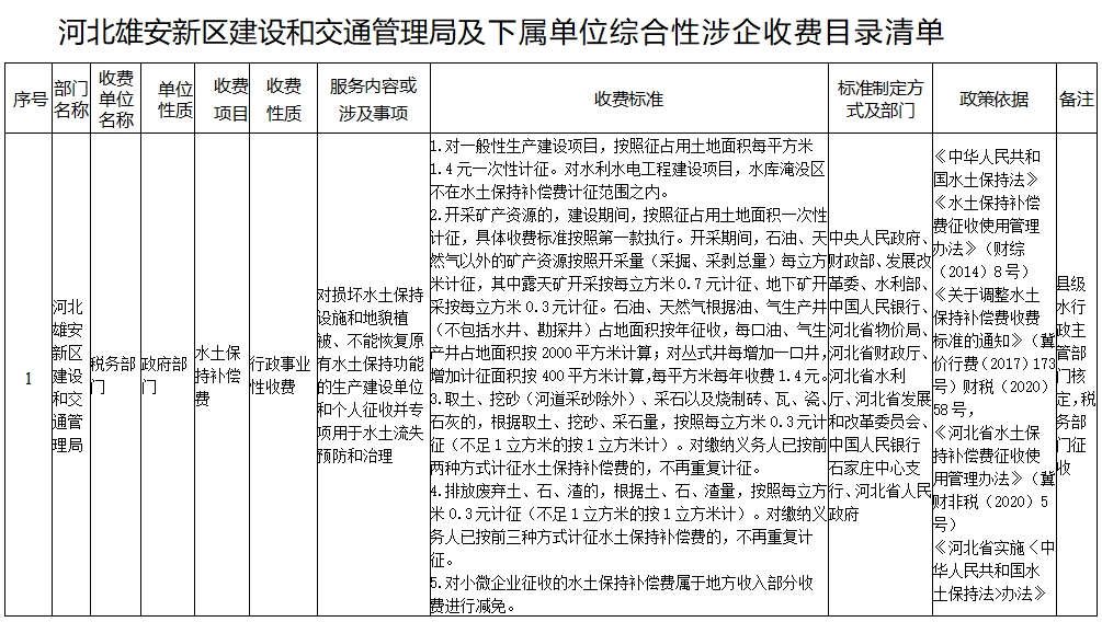 河北雄安新区建设和交通管理局及下属单位综合性涉企收费目录清单