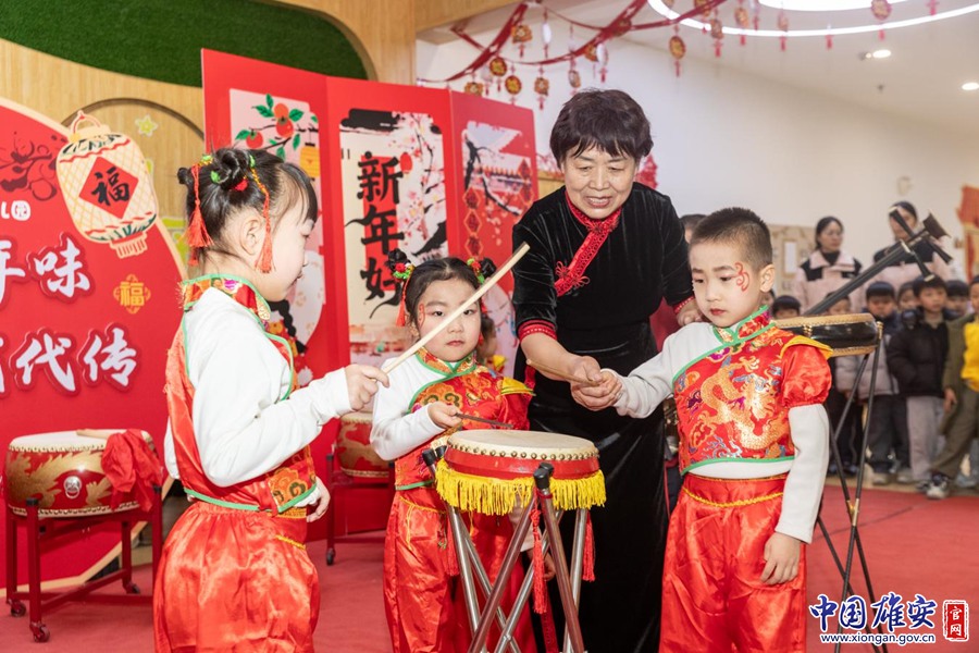 西河大鼓传承人王凤仙指导小朋友们打鼓。中国雄安官网牛思佳 摄