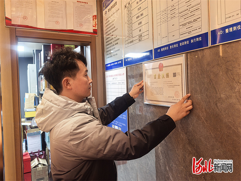 2月11日,“五谷丰登”餐饮店老板朱丽君正在摆放营业执照。河北日报记者解楚楚 摄