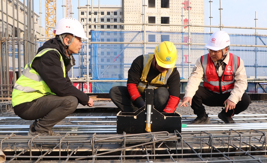 下午3时30分,项目安全总监申志超在4号楼施工平台上边走边查看,锐利的目光扫过纵横交错的钢筋“矩阵”。“每根钢筋都是建筑的‘生命线’,每根钢筋都系着家人的牵挂。”他俯身用卡尺测量间距时嘱咐施工人员,“要精准把控加工与安装细节,主筋、箍筋的间距、标高、锚固长度要严格按图纸执行。”