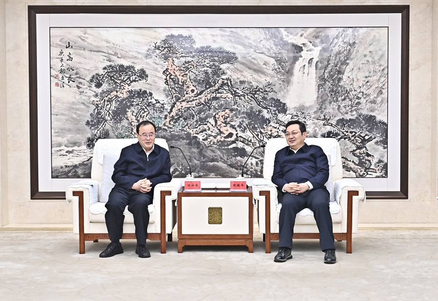 张国华与中国南水北调集团有限公司党组书记、董事长汪安南一行举行工作座谈。刘向阳 摄