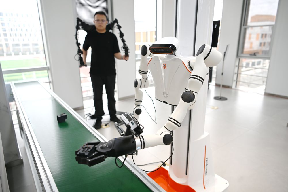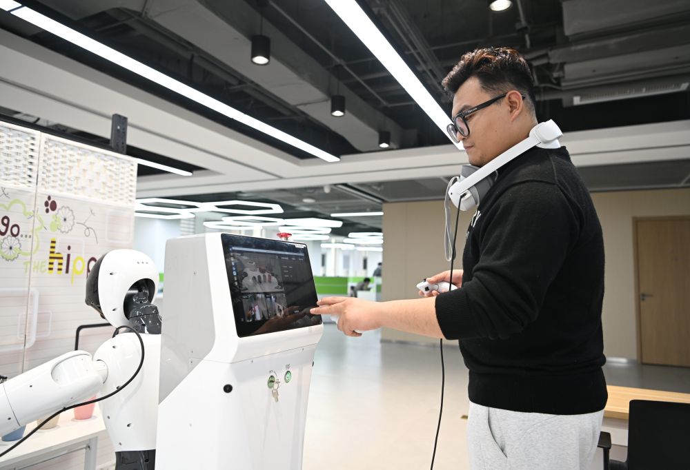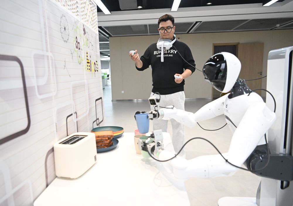 3月17日,在中国雄安集团数字城市科技有限公司具身智能训练场,工作人员采集机器人训练数据。