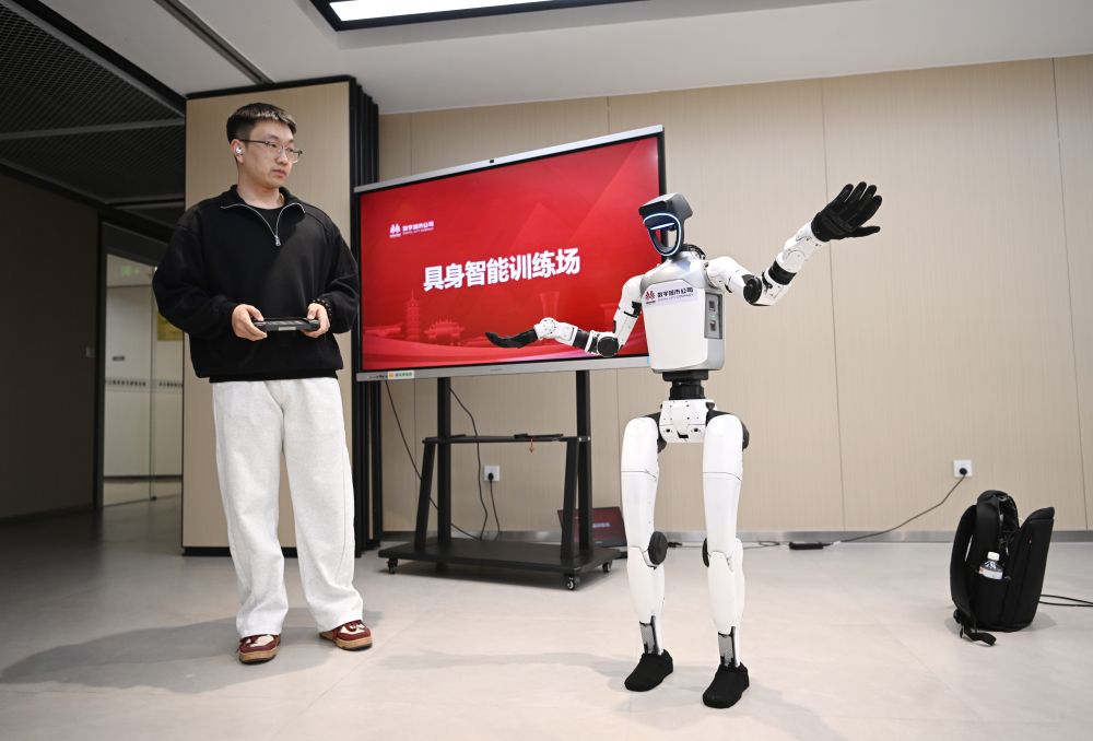 3月17日,在中国雄安集团数字城市科技有限公司具身智能训练场,工作人员对机器人进行具身智能训练。