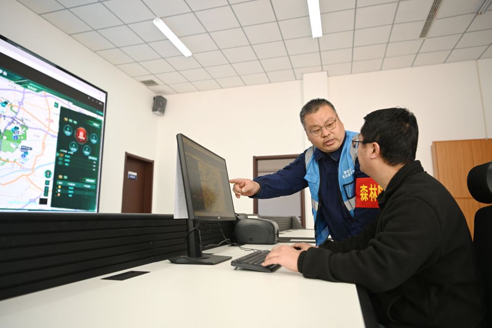 ↑3月19日,刘世光(左)在雄安新区“千年秀林”雄中片区管护调度室与工作人员交流巡检工作。新华社记者朱旭东 摄