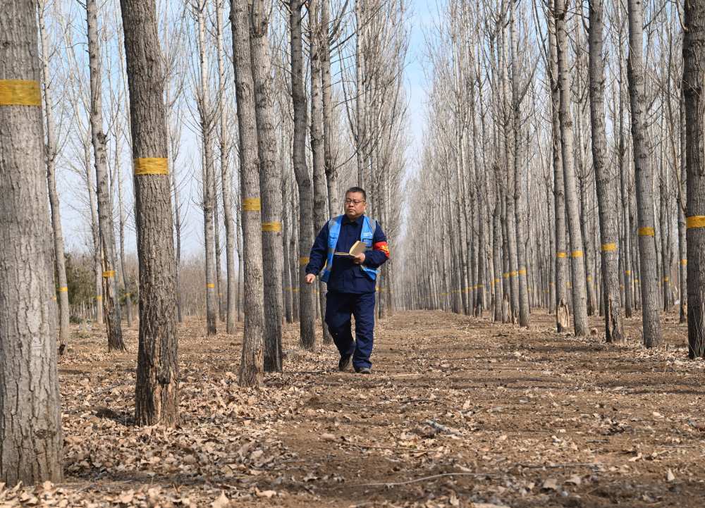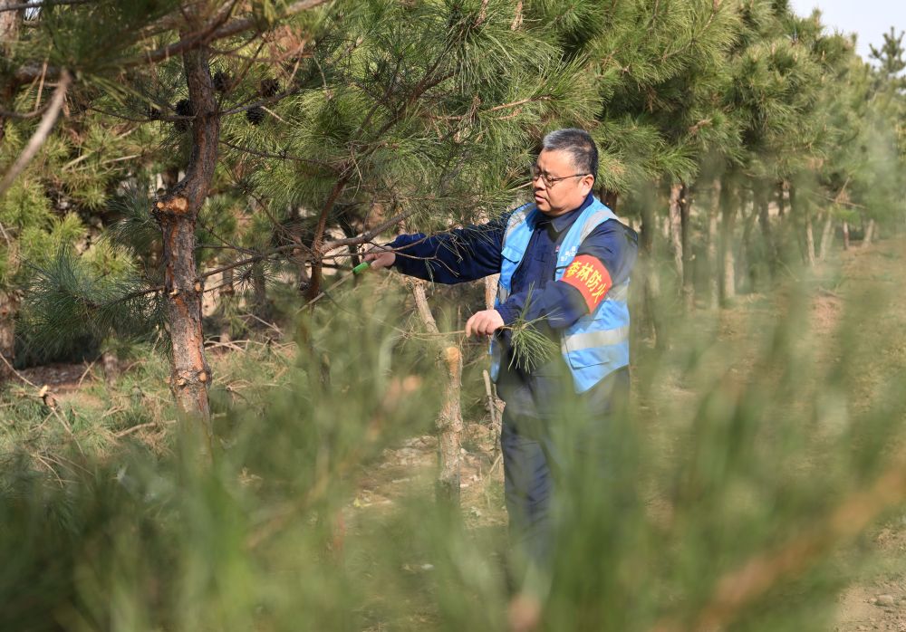 ↑3月19日,刘世光在雄安新区“千年秀林”雄中片区的树林里查看病虫害情况。新华社记者朱旭东 摄