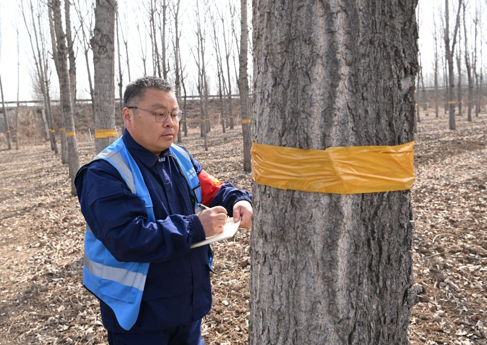 ↑3月19日,刘世光在雄安新区“千年秀林”雄中片区的树林里测量树木生长量。新华社记者朱旭东 摄