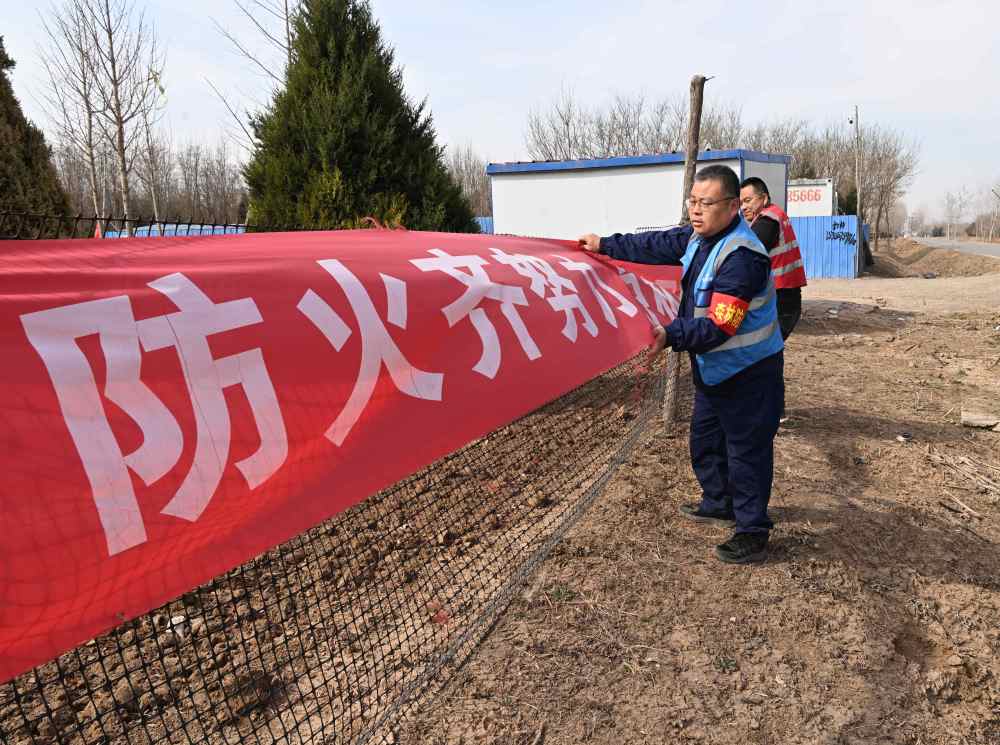 ↑3月19日,刘世光(前)在雄安新区“千年秀林”雄中片区悬挂防火宣传横幅。新华社记者朱旭东 摄